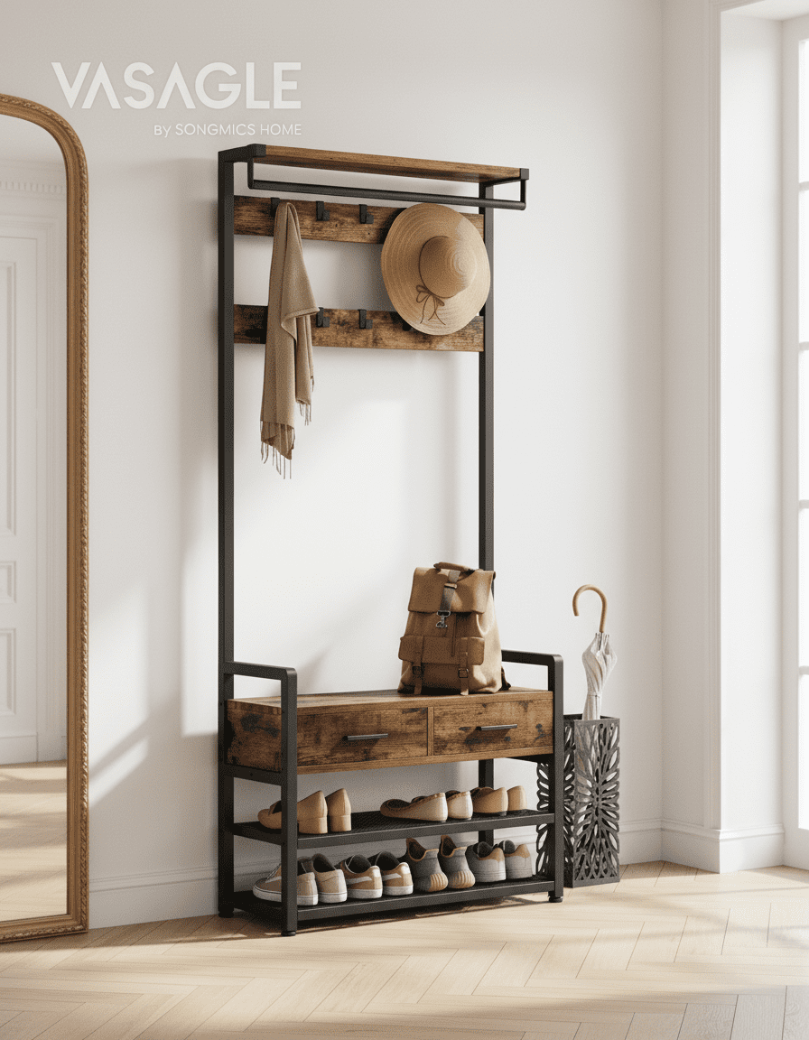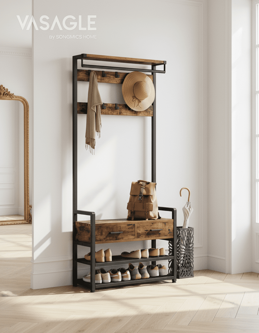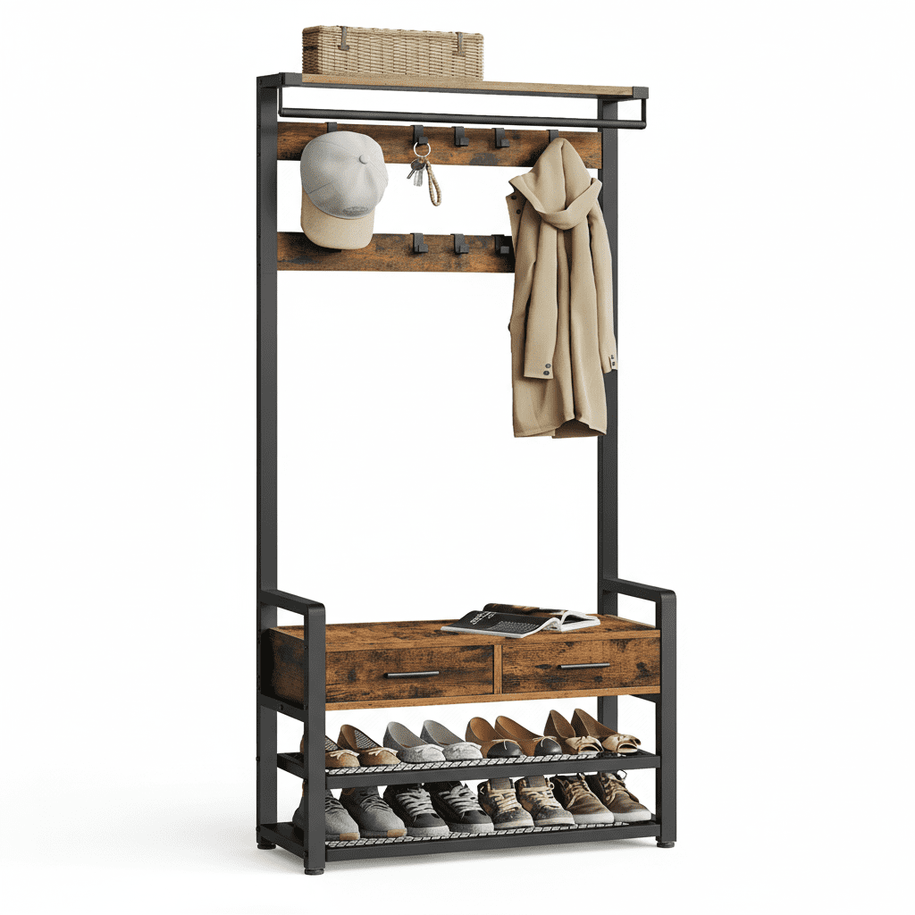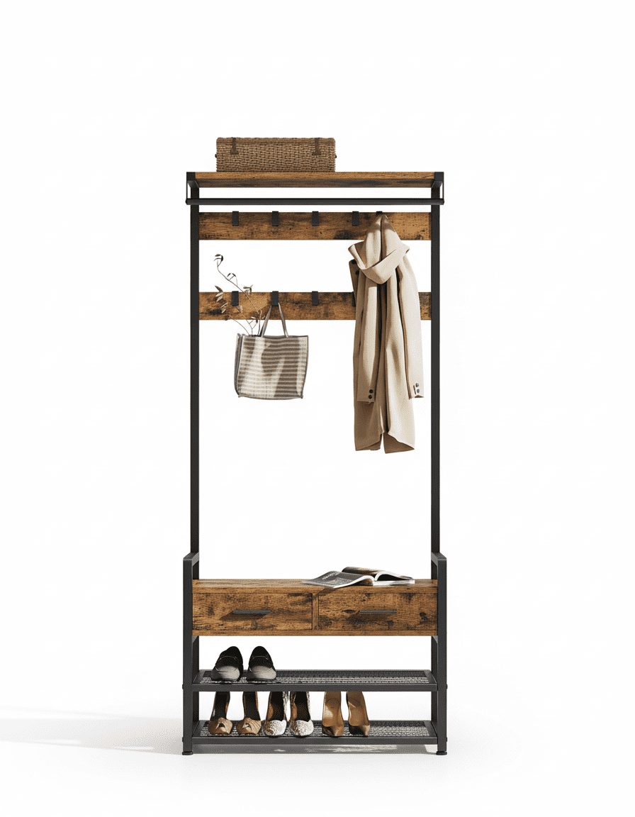 Transformez votre entrée en espace ultra-organisé ! Ce porte-manteau 6-en-1 avec 10 crochets et 2 tiroirs optimise chaque centimètre. Fini le désordre ! Découvrez-le