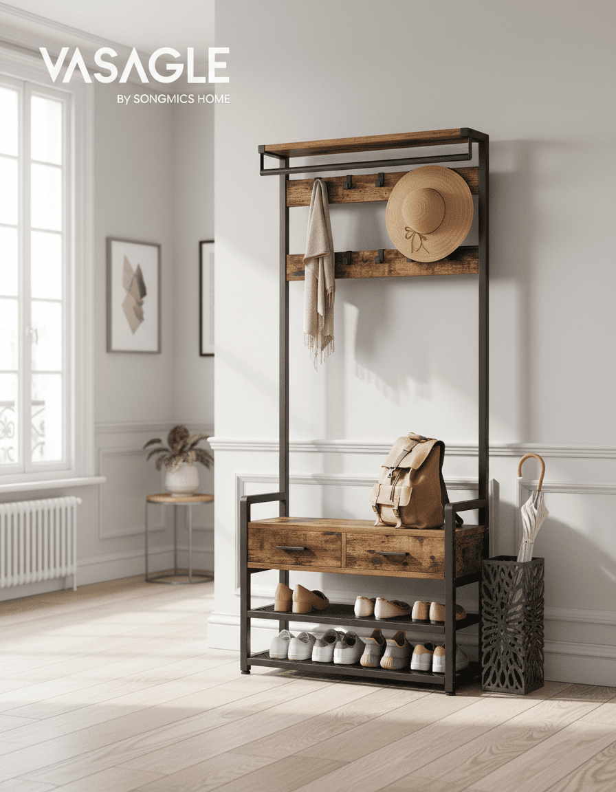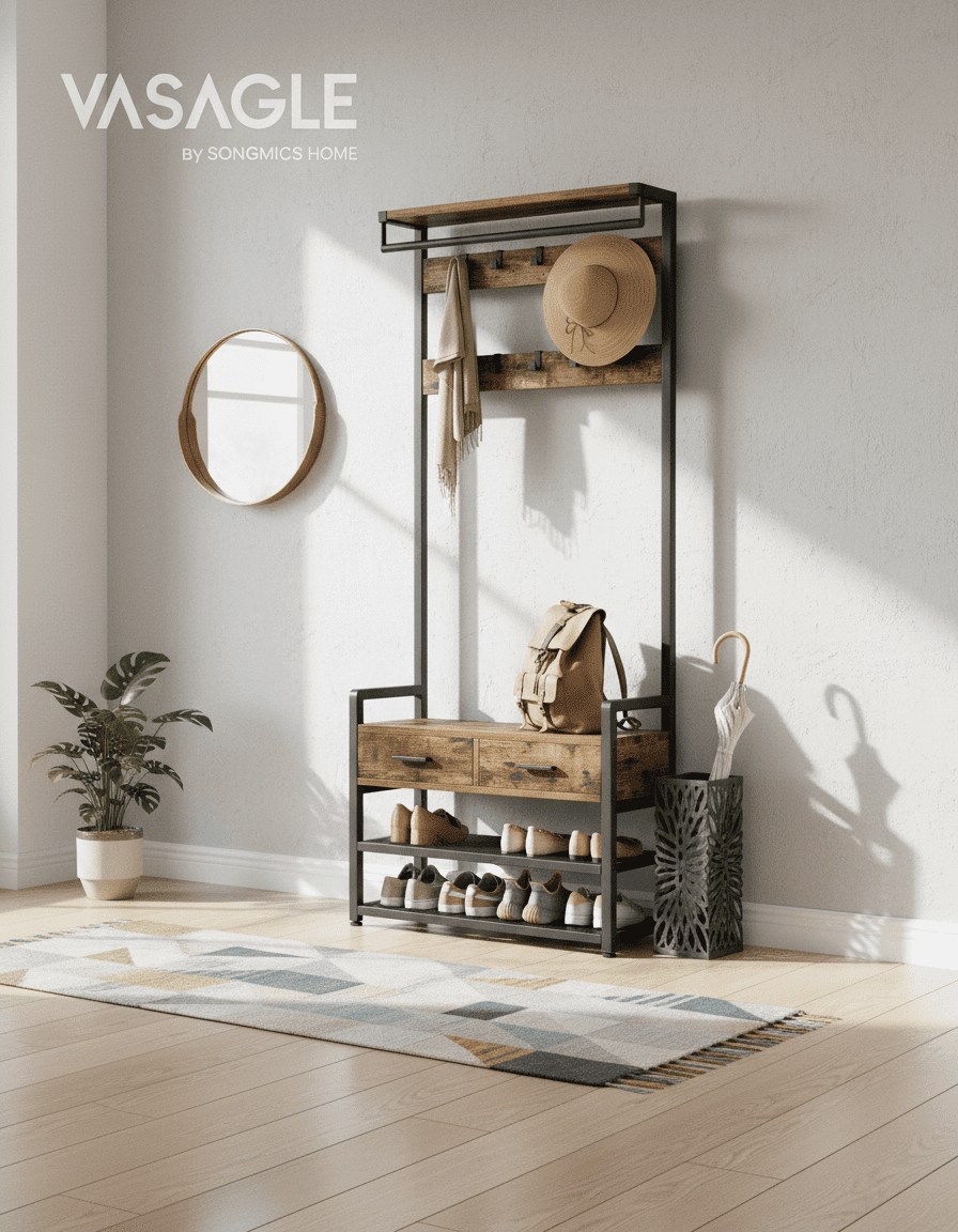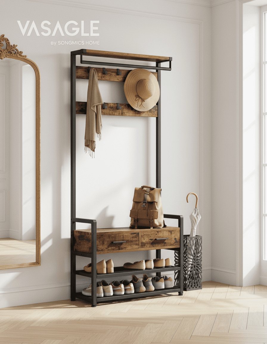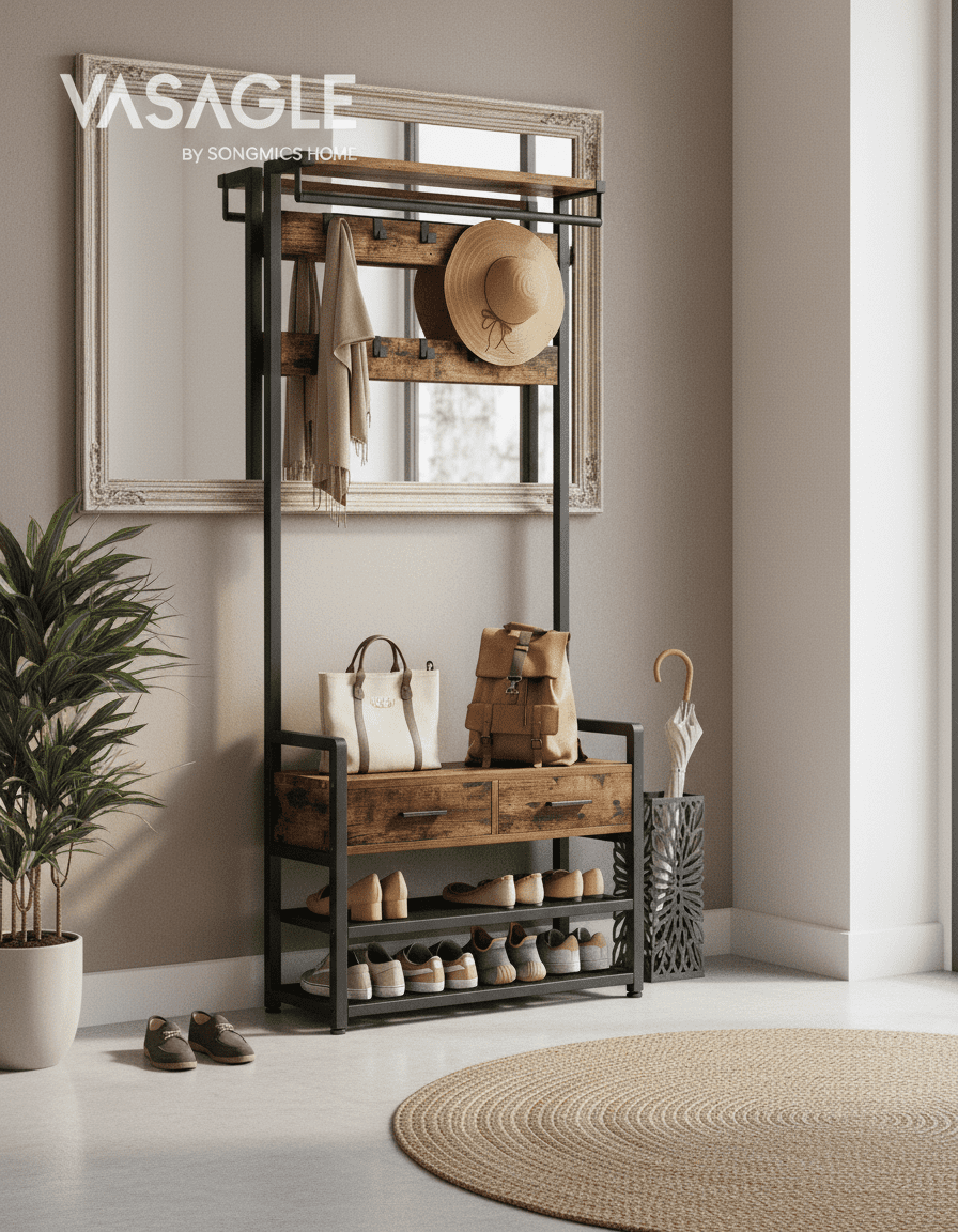 Transformez votre entrée en espace ultra-organisé ! Ce porte-manteau 6-en-1 avec 10 crochets et 2 tiroirs optimise chaque centimètre. Fini le désordre ! Découvrez-le