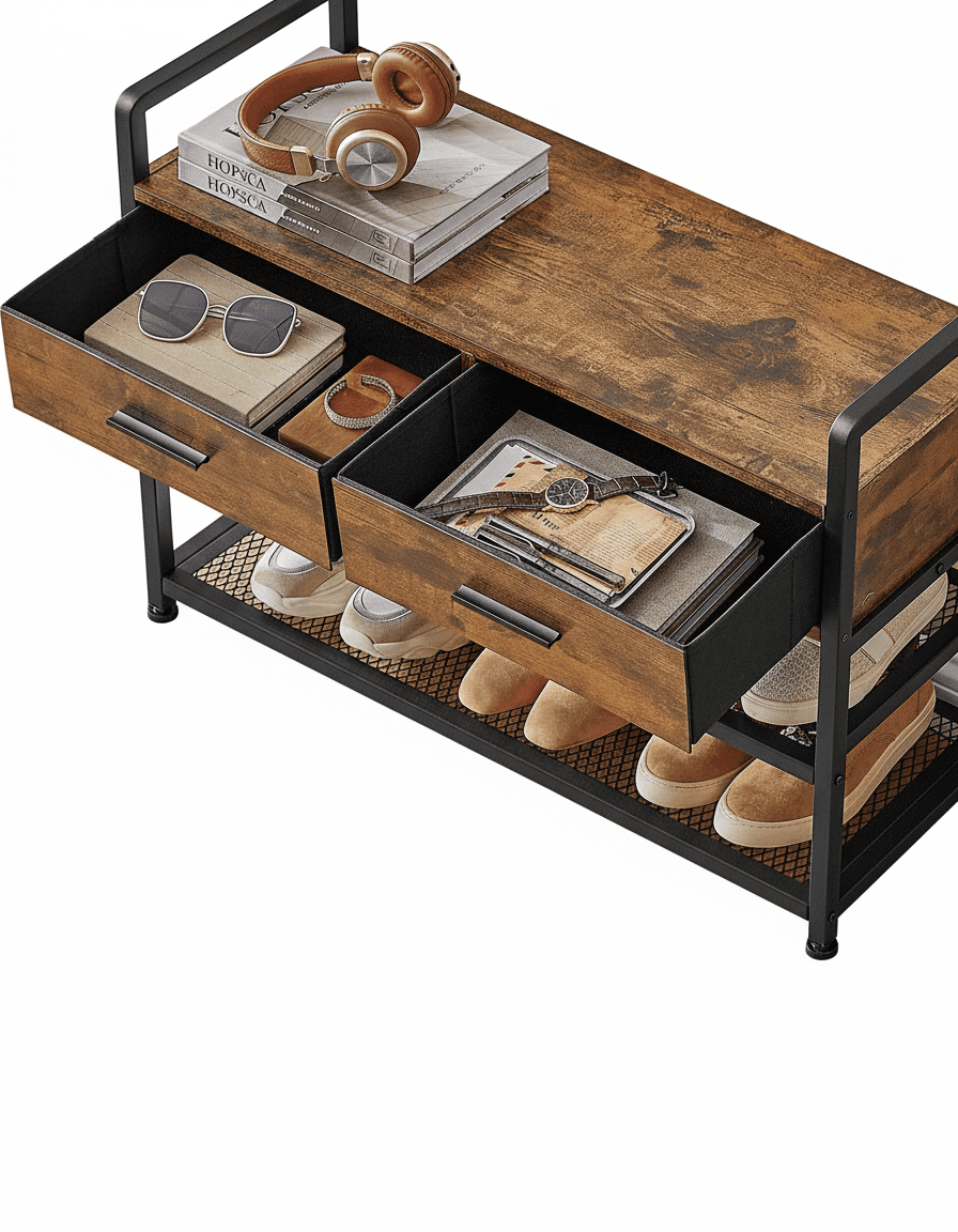 - 2 tiroirs en tissu Oxford résistant → Rangement discret pour gants, clés, parapluies → Entrée toujours impeccable pour vos invités