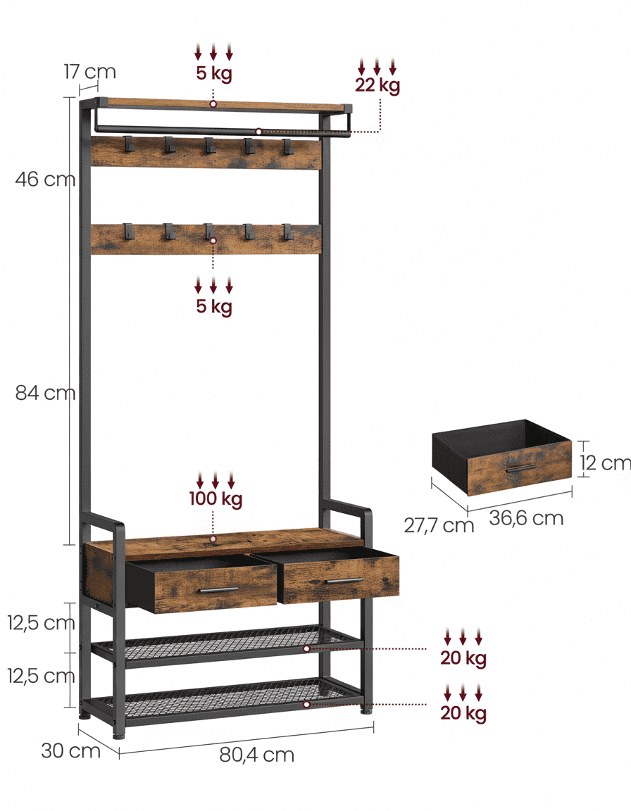 - 10 crochets amovibles → Suspendez manteaux, chapeaux, écharpes et sacs → Accès instantané à vos affaires sans fouiller