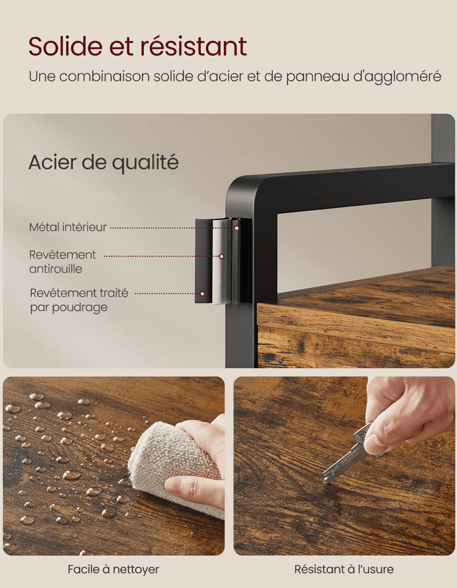 - Matériaux : Panneau d’aggloméré de qualité, structure acier