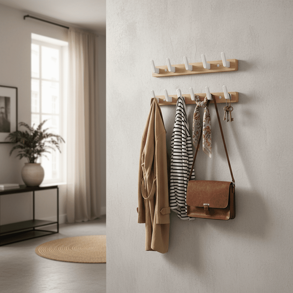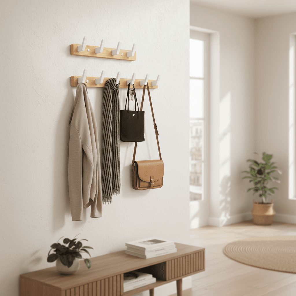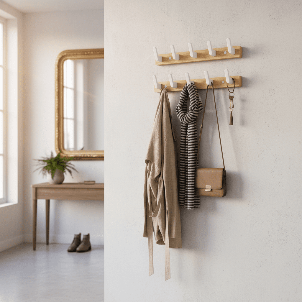 - 6 crochets robustes en bois de noyer → Suspendez manteaux, sacs et accessoires sans limite de poids → Optimisez votre espace de rangement au quotidien