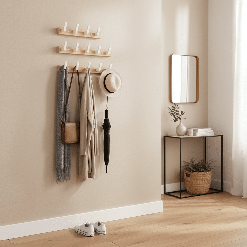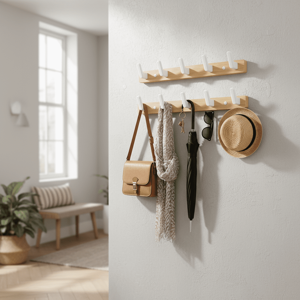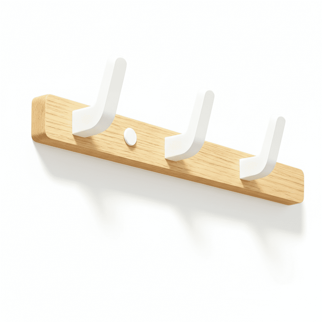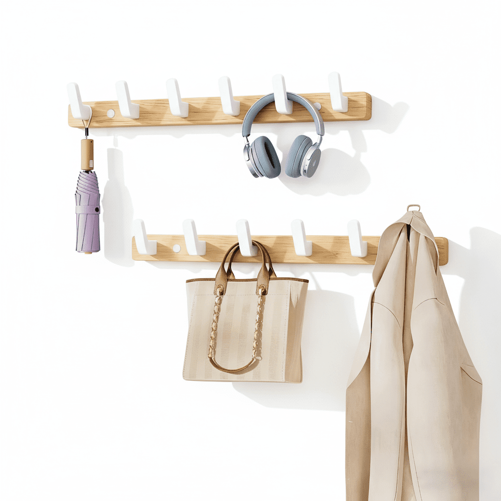 - 6 crochets robustes en bois de noyer → Suspendez manteaux, sacs et accessoires sans limite de poids → Optimisez votre espace de rangement au quotidien